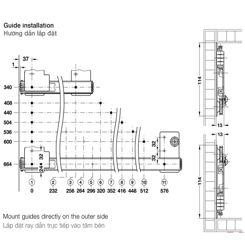 - Lắp đặt thuận tiện: Thi công thông qua lỗ khoan tiêu chuẩn 32 mm, bộ sản phẩm đi kèm ray trượt, cáp và vít điều chỉnh giúp tiết kiệm thời gian lắp đặt.