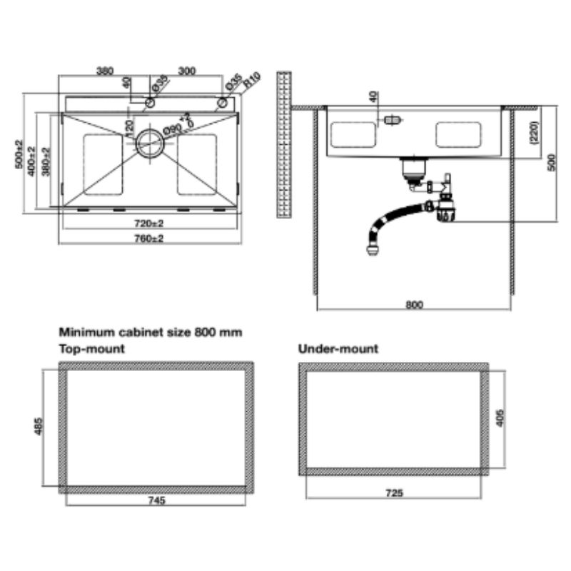 - Kích thước cắt đá lắp nổi (D x R):745 x 485 mm