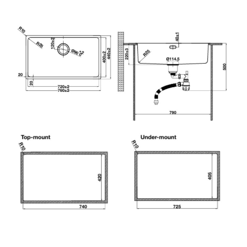 - Kích thước cắt đá (D x R):Lắp nổi: 740 x 420 mm – Lắp âm: 725 x 405 mm