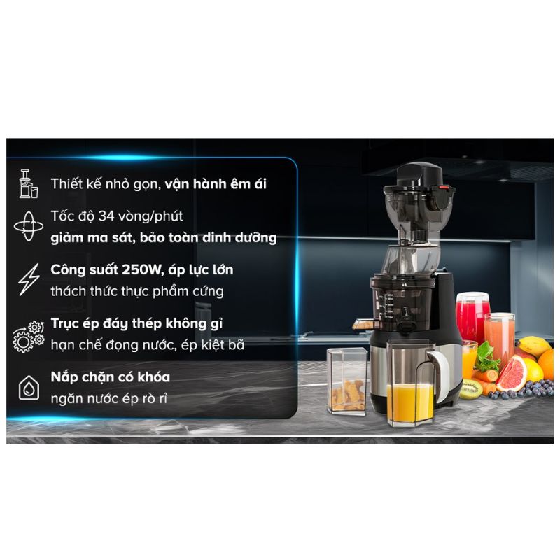 - Vòi ra nước ép chống nhỏ giọt, có nắp khóa kín miệng vòi, ngăn nước ép rò rỉ hiệu quả.