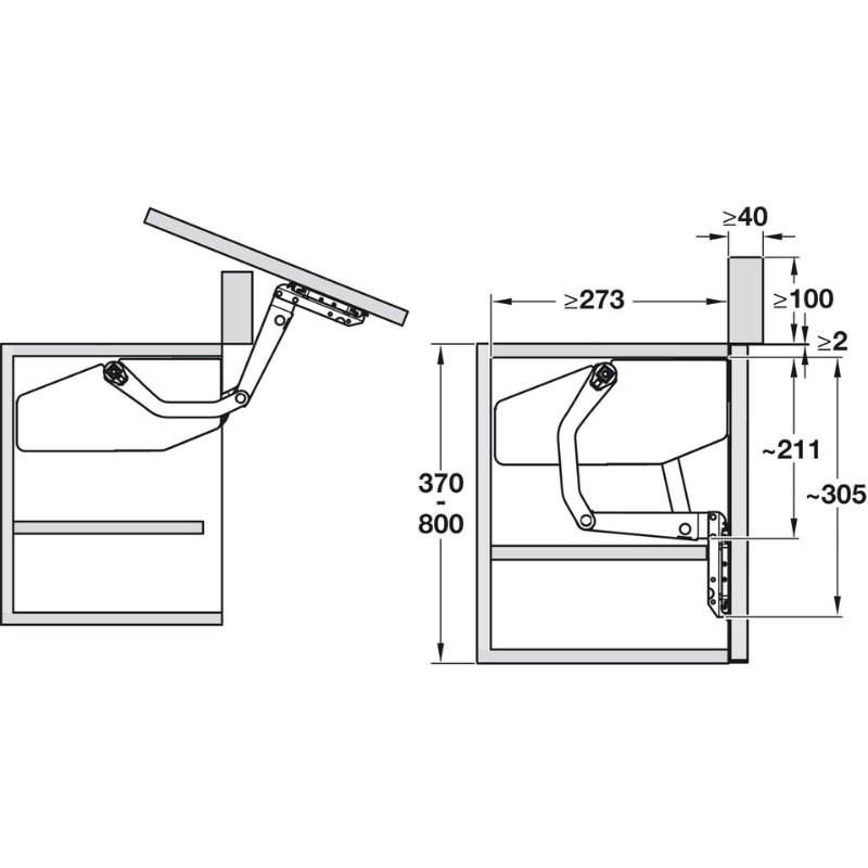 - Tối ưu cho tủ tiêu chuẩn: Sử dụng hiệu quả cho tủ cao từ 500–670 mm, nâng đỡ cánh có trọng lượng từ 7,0 đến 15,9 kg, thích hợp với các cánh tủ lớn và nặng.