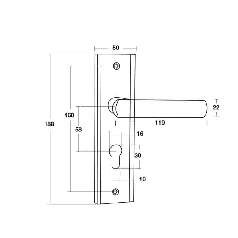 - Kích thước từ tay nắm đến lỗ khóa: 58mm