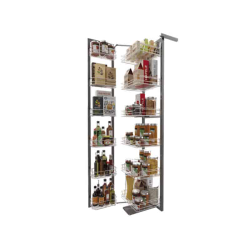Tủ Kho Dolce 6 Tầng 600mm Hafele 548.65.053 gồm 2 dãy rổ song song (một dãy gắn ở cửa và một dãy gắn trên khung chính). Cách bố trí này mang đến nhiều tiện lợi: